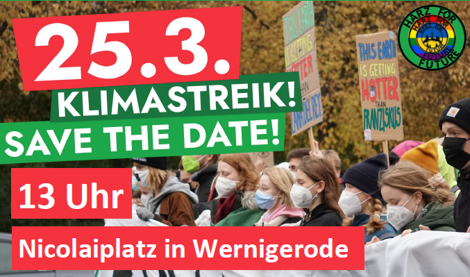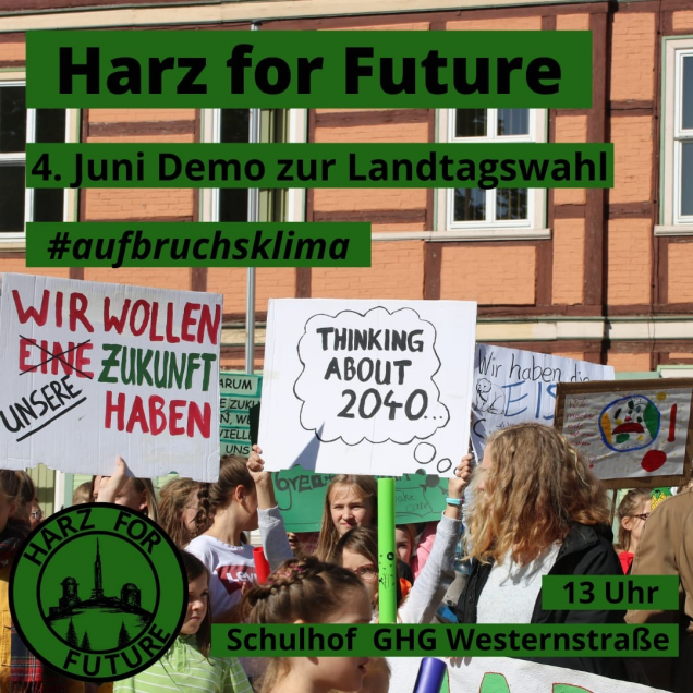 Am 4. Juni findet im Zuge der Landtagswahlen in Sachsen-Anhalt eine Klimademo in Wernigerode statt. Der Demozug startet 13 Uhr auf dem Schulhof des Gerhart-Hauptmann Gymnasiums in der Westernstraße. Es herrscht #aufbruchsklima und die Politik muss endlich nachhaltiger werden! Deswegen: Kommt mit uns auf die Straße und Eltern wählt für eure Kinder!