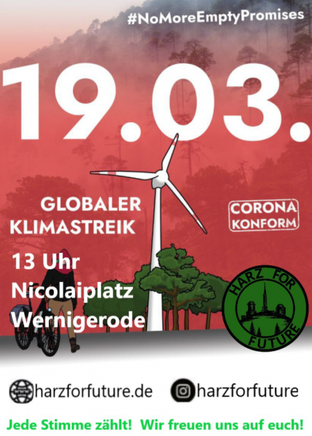 Am 19.03. fand abermals ein weltweiter Klimastreik unter dem Motto: "#NoMoreEmptyPromises" statt. Über 80 Menschen beteiligten sich auch bei uns in Wernigerode daran um ihr klares "Nein" zu einem "weiter so" der Klimapolitik zum Ausdruck zu bringen!