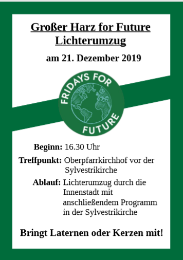 Am 21.12.2019 lud Harz for Future zu einem vorweihnachtlichen Lichertumzug durch die Straßen von Wernigerode ein. Nach einer kurzen Mahnwache auf dem Kohlmarkt endete der Umzug in der Sylvestriekirche, in der es für alle Teilnehmende ein buntes Programm mit Musik und Reden gab.